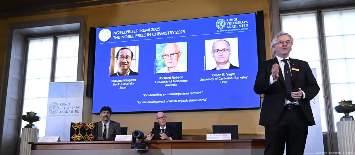 La Academia sueca concedió el Premio Nobel de Química 2025 a Susumu Kitagawa, de Japón, Richard Robson, nacido en Reino Unido, y Omar M. Yaghi, jordano-estadounidense "por el desarrollo de estructuras metal-orgánicas".